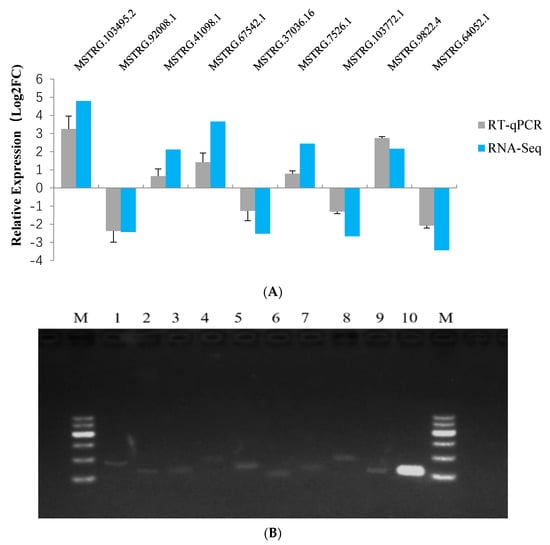 (A) RT-qPCR validation of nine differentially expressed lncRNAs identified using RNA-Seq. These result data showed the mean ±SD for three independent biological replicates and error bars indicated standard deviation. (B) RT-PCR amplification of lncRNAs using specific primers. 1: MSTRG.103495.2; 2: MSTRG.92008.1; 3: MSTRG.41098.1; 4: MSTRG.67542.1; 5: MSTRG.37036.16; 6: MSTRG.7526.1; 7: MSTRG.103772.1; 8: MSTRG.9822.4; 9: MSTRG.64052.1; 10: β-actin; M: marker (M1100, Solarbio, China), lanes represents 100–600 bp.