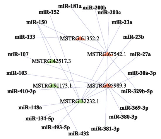 The function of lncRNAs could be achieved by targeting miRNAs [,,]. The top 10 up-regulated and down-regulated lncRNAs and their target miRNA sponges are listed in Supplementary File 5. In order to improve the visibility of the results, the three most prominent up-regulated lncRNAs (MSTRG.95989.3, MSTRG.67542.1, and MSTRG.61352.2) and the three most prominent down-regulated lncRNAs (MSTRG.32232.1, MSTRG.91173.1, and MSTRG.42517.3) were selected to predict target miRNA sponges using miRanda v3.3a. For the six lncRNAs, a total of 217 pairs of the lncRNA–miRNA interaction were obtained, of which 21 target miRNAs with known function in previous literatures were screened to construct a lncRNA-miRNA network (Figure 3) [,,,,]. Some target miRNA sponges of the six lncRNAs found in the study have been previously related with lactation and the development of mammary gland in dairy goats and cows [,,,]. For example, MSTRG. 32232.1 would target 16 miRNA sponges, among which miR-148a and miR-152 were found to be associated to lactation and the development of mammary gland development in dairy goats [] and dairy cows [].