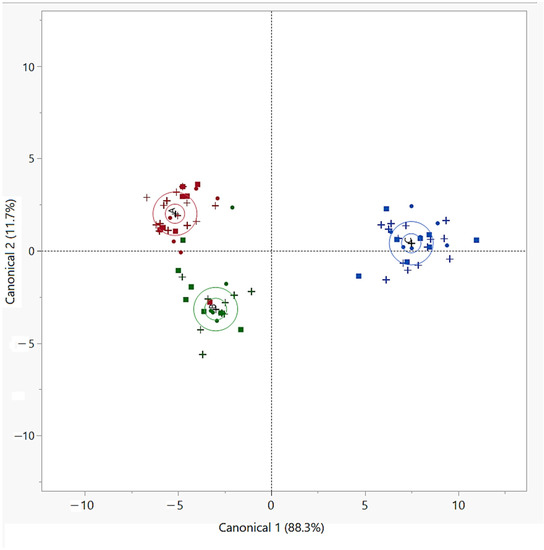 Canonical plot of the linear discriminant analysis performed on cheese samples, grouped by farm (O, M, C), using milk samples from Lopez et al. [22] as training set. In the plot, each group is associated with a 95% confidence ellipse for the mean and a 50% prediction ellipsoid. Legend: red = Farm O (organic-certified farm); green = Farm M (mountain farm); blue = Farm C (conventional lowland farm); + = milk; ■ = fresh cheese; ● = semi-hard cheese.