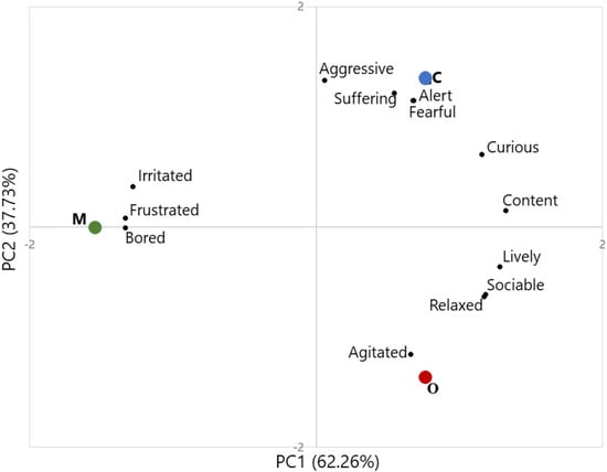These welfare conditions are confirmed by QBA results, presented in Figure 2. PCA plot shows that farm M is positioned on the left side of PC1 (62.26% of explained variance), which carries information about the valence of the emotional state of goats. In fact, this farm was mainly characterized by descriptors such as irritated, frustrated and bored, indicative of a negative emotional state. On the contrary, farms O and C are on the right side of PC1, with higher loadings of positive descriptors such as content, lively, sociable, curious and relaxed. Some differences between farms O and C can be observed on PC2 (37.73% of explained variance), where C is characterized by higher loadings of aggressive, alert, suffering and fearful, and O is mainly described as agitated.