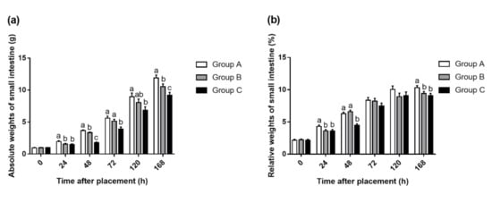 Absolute weights (a) and relative weights (b) of the small intestine in Group A (fed immediately), B (first feed administered for 24 h), and C (first feed administered for 48 h). Mean values with their SEM (n = 6). (a–c) Mean values within a row with unlike letters were significantly different (p < 0.05).