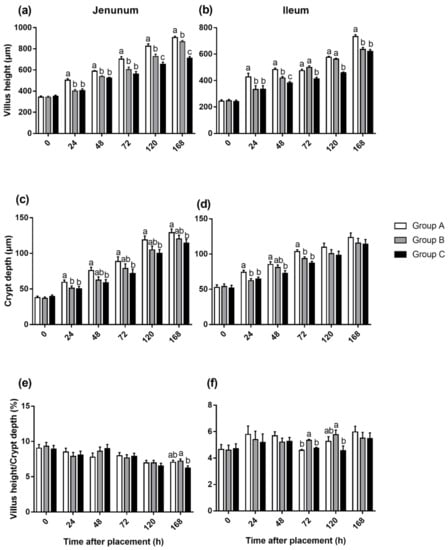 Jejunum and ileum villus height (a,b), crypt depth (c,d) and villus height: crypt depth ratio (e,f) of Group A (fed immediately), B (first feed administered for 24 h), and C (first feed administered for 48 h). Mean values with their SEM (n = 6). (a–c) Mean values within a row with unlike letters were significantly different (p < 0.05).