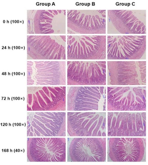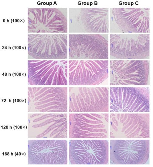 The results of absolute weight of the small intestines suggested that Group A had the highest weight than the other two groups, followed by Group B, and finally Group C (Figure 1a, p < 0.05), thereinto no difference was observed between Groups A and B at 72 and 120 h. Additionally, the highest relative weight of the small intestine was still observed at Group A (Figure 1b, p < 0.05). During the fasting period, the relative weight of the small intestine in Groups B and C was significantly lower than that of Group A (p < 0.05), and then increasing to the same level of Group A at 48 and 72 h, respectively, after refeeding. It was not until 168 h that Group A was significantly higher than Groups B and C in the relative weight of the small intestine (p < 0.05).