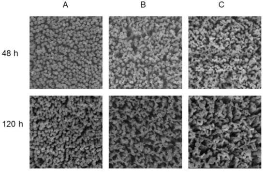 Scanning electron-photomicrograph of the duodenum mucosa microvillus on Group A (fed immediately), B (first feed administered for 24 h) and C (first feed administered for 48 h) at 48 and 120 h after placement (×40,000).