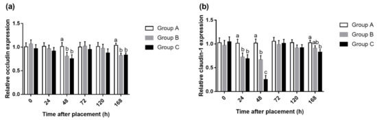 Relative gene expressions of occludin (a) and claudin-1 (b) in the jejunum on three groups at 0, 24, 48, 72, 120, and 168 h after placement. Values are means and SEM represented by vertical bars (n = 6). (a–c) Mean values with unlike letters were significantly different (p < 0.05).