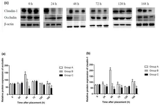 Relative gene expressions of occludin (a) and claudin-1 (b) in the jejunum on three groups at 0, 24, 48, 72, 120, and 168 h after placement. (c) are representative blots of occludin, claudin-1, and β-actin at 0, 24, 48, 72, 120, and 168 h after placement. Values are means and SEM represented by vertical bars (n = 6). (a–c) Mean values with unlike letters were significantly different (p < 0.05).