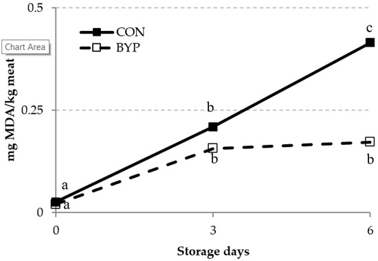 Effect of the dietary treatment (CON and BYP) and storage time (0, 3, and 6 days) on the concentration of TBARS (expressed as mg malonaldehyde (MDA)/kg meat) measured in lamb meat stored in unmodified atmosphere at 2 °C. a, b, c Within each dietary treatment, different superscripts indicate differences between days of storage (p < 0.05). In repeated measures ANOVA, values of p were 0.134, <0.001, and 0.095 for diet, time, and diet × time interaction, respectively, and standard error of the mean (SEM) values were 0.0326 and 0.0399 for diet and time effects, respectively.