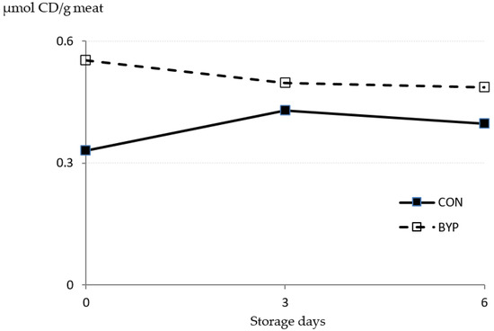 Effect of the dietary treatment (CON and BYP) and storage time (0, 3, and 6 days) on the concentration of conjugated dienes (CD; expressed as µmol/g meat) measured in lamb meat stored in unmodified atmosphere at 2 °C: in repeated measures ANOVA, values of p were 0.219, 0.642, and 0.740 for diet, time, and diet × time interaction, respectively, and standard error of the mean (SEM) values were 0.0265 and 0.0325 for diet and time effects, respectively.