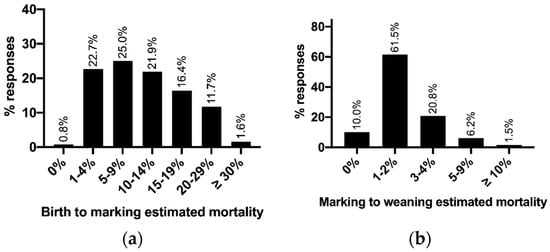 Producer estimated lamb mortality rates from a 2019 NSW sheep producer survey: (a) from birth until marking (n = 128); (b) from marking to weaning (n = 130).