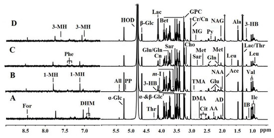 Typical examples of 600-MHz 1H NMR spectra (δ0.5–6.0 and δ6.5–9.0) of serum metabolites were obtained from the (A) CON group, (B) HLB group, (C) RSM group, and (D) HLB + RSM group respectively. Keys: For: Formate; 1-MH: 1-Methylhistidine; 3-MH: 3-Methylhistidine; Phe: Phenylalanine; 3-HB: 3-Hydroxybutyrate; DHM: 3, 4-Dihydroxymandelate; All: Allantoin; Glc: Glucose; PP: Phophoenolpyruvate; Thr: Threonine; m-I: myo-Inositol; ac: Lactate; Cn: Creatinine; Gln: Glutamine; Glu: Glutamate; Bet: Betaine; Sar: Sarcosine; GPC: Glycerolphosphocholine; Cho: Choline; Cr: Creatine; TMA: Trimethylamine; MG: Methylguanidine; DMA: Dimethylamine; Cit: Citrate; Py: Pyruvate; Met: Methionine; AA: Acetoacetate; NAG: N-acetylglycoprotein; NAA: N-Acetylaspartate; AD: Acetamide; Ace: Acetate; Ala: Alanine; Val: Valine; Ile: Isoleucine; IB: Isobutyrate.