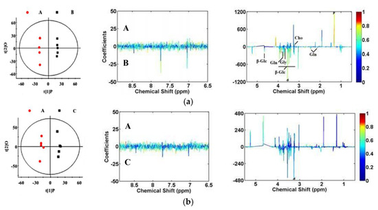1H NMR spectra were manually calibrated by stages and baseline with MesReNova 7.1 software (Mestrelab Research S. L., Santiago de Compostela, Spain). Prior to Fourier transformation, the free induction decays (FID) were multiplied by an exponential function with a 1.0 Hz line-broadening factor. The 1HNMR spectra were referenced to the L-actate resonance at 1.33 ppm. Each spectrum within the range of 9.0–0.5 was divided into 0.002 ppm bins excluding the residual water region and adjacent spectral peaks from 5.10 to 4.66 ppm and 4.64 to 4.25 ppm. According to the total integrated intensity of each spectrum to normalize the integrals before pattern recognition analysis [26]. The normalized data were subjected to pattern recognition multivariate analysis with the software SIMCA-P+10.0 (Umetrics, Umeå, Sweden), and principal component analysis (PCA) used a data scale conversion method of mean center scaling [27] to generate an overview of the sample distribution and observe possible outliers. Partial least squares (PLS) and orthogonal projection to latent structure (OPLS) were performed on the normalized data, which employed SIMCA-P+ software to find the correlation between NMR data (X variable) and other variables (Y variable, grouping information). Unit variance scaling was used to be the data scale conversion method of partial least squares-discriminant analysis (PLS-DA) and orthogonal projection to latent structure with discriminant analysis (OPLS-DA) [28]. The quality of the model was tested by the PLS-DA with the 5-fold cross-validation method, and the validity of the model was judged by the cross-validation of RX2 and Q2 (representing the model-interpretable variables and the predictability of the model, respectively). After that, the effectiveness of the model was further tested by changing the ranking order of classification variable y several times (n = 100) to obtain corresponding random Q2 values. The parameter of Q2 represents the predictive ability of the model. A model was considered significant when the Q2 value was significant (p < 0.05) through permutation. In order to facilitate the interpretation of results, the metabolites coefficient-coded loading that indicated altered metabolites among the different groups were back-transformed in Excel 2010 (Microsoft, Redmond, WA, USA) and plotted with color-coded absolute coefficient values (|r|) of the variables in Matlab script 7.0 (The Mathworks Inc., Natick, MA, USA) to identify the significant contributing metabolites.
