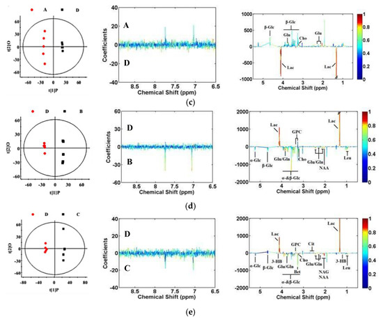 Orthogonal projection to latent structure with discriminant analysis (OPLS-DA) scores plots (left panel) derived from 1H NMR spectra of serum and corresponding coefficient loading plots (right panel) were obtained from the (A) CON group, (B) HLB group, (C) RSM group and (D) HLB + RSM group. Score plot of serum: (a): CON group vs. HLB group, R2X = 22.5%, and Q2 = −0.077; (b): CON group vs. RSM group, R2X = 25.8%, and Q2 = −0.480; (c): CON group vs. HLB + RSM group, R2X = 26.2%, and Q2 = −0.241; (d): HLB + RSM group vs. HLB group, R2X = 24.7%, and Q2 = −0.503; (e): HLB + RSM group vs. RSM group, R2X = 28.4%, and Q2 = −0.341. Keys were the same as shown in Figure 1. The color map shows the significance of metabolites variations between the two classes. Peaks in the positive direction indicate that the metabolites are more abundant in the groups in the positive direction of the first principal component. Therefore, peaks in the negative direction indicate that metabolites that are more abundant in the groups in the negative direction of the first principal component.