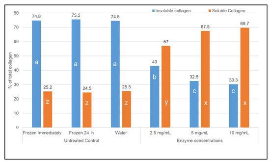 Effect of collagenase at different concentrations on insoluble and soluble collagen (% of total collagen) in ground woody breast meat. Letters a, b, and c represent significant differences in insoluble collagen while letter x, y, and z represent significant differences in soluble collagen among the treatments (p ≤ 0.05).