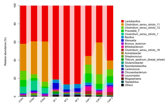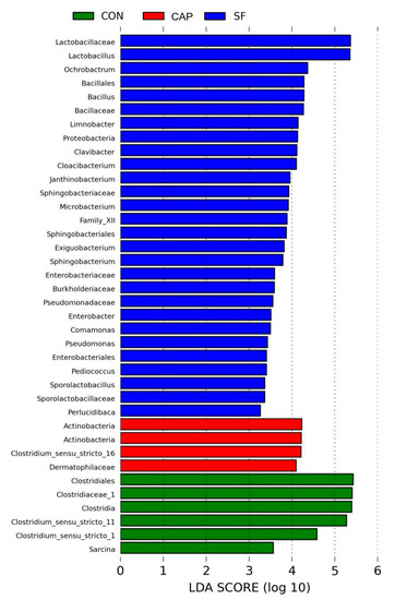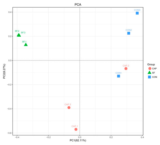 The composition of the bacterial community was compared between various treatments and analyzed by the β-diversity analysis. As shown in Figure 1, the principal component analysis clearly indicated variability of the microbial community. Separate analysis of the SF group samples versus the samples of the CON and CAP groups indicates that the addition of SF has an impact on the microbial community. Interestingly, the samples of the CAP group had a similar microbial community to that in the CON group.