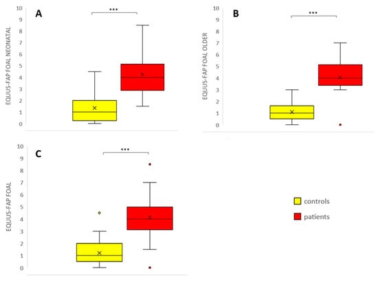 EQUUS-FAP FOAL (Equine Utrecht University Scale for Facial Pain Assessment for foals) patients versus controls; (A): EQUUS-FAP FOAL in neonatal foals (0–14 days) (n = 10 patients, n = 17 controls); (B) EQUUS-FAP FOAL in older foals (14 days–6 months) (n = 10 patients, n = 22 controls); (C): EQUUS-FAP FOAL in all foals (n = 20 patients, n = 39 controls). Lines in boxes show median scores; boxes show 25–75th percentiles; error bars show 5–95th percentiles and outliers are shown as dots. *** = p < 0.001.