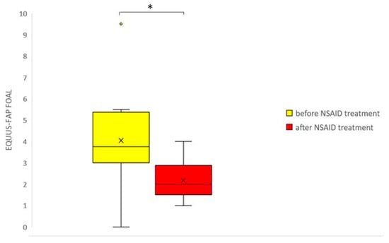 EQUUS-FAP FOAL (Equine Utrecht University Scale for Facial Pain Assessment for foals) in patients, directly before versus 1–2 h after NSAID (Non-Steroidal Anti Inflammatory Drugs) treatment (either Flunixin meglumine or Meloxicam IV). Lines in boxes show median scores; boxes show 25–75th percentiles; error bars show 5–95th percentiles and outliers are shown as dots.* = p < 0.05 (n = 12).