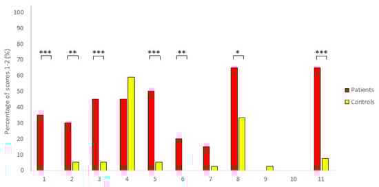 EQUUS-FAP FOAL (Equine Utrecht University Scale for Facial Pain Assessment for foals) frequency distribution; facial action unit 1: head movement, facial action unit 2: eyelids, facial action unit 3: focus, facial action unit 4: nostrils, facial action unit 5: corners mouth/lips, facial action unit 6: muscle tone, facial action unit 7: yawning, facial action unit 8: smacking with the lips, facial action unit 9: teeth grinding, facial action unit 10: moaning, facial action unit 11: ears. Percentage of scores 1–2 (%) = percentage of foals that had a score of 1 or above for each facial action unit, * = p < 0.05, ** = p < 0.01, *** = p < 0.001. (n = 20 patients, n = 39 controls).