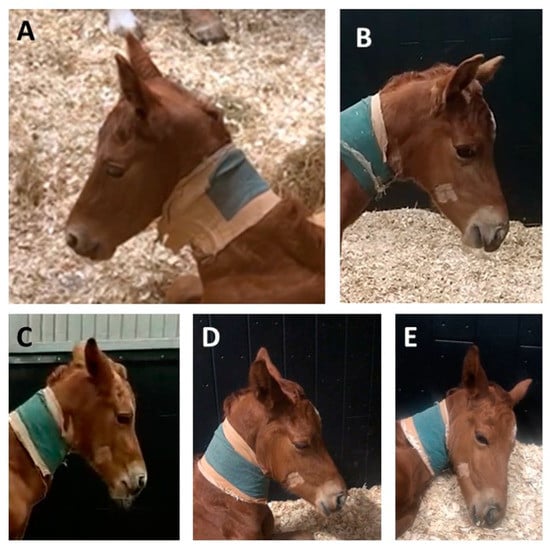 Panel A shows a bright and alert foal 2 h after NSAID treatment on day 2 after surgery. The position of the eyelids cannot be completely evaluated due to the direction of the camera. Panel B shows strained corners of the mouth (score 2) and a slightly raised upper eyelid (score 1). Panel C shows backwards-directed ears (score 2) and slightly strained corners of the mouth (score 1). Panel D shows the backwards position of the ears (score 2) and tightened eyelids (score 2), while the corners of the mouth are relaxed (score 0). Panel E shows the foal during rest, with slightly tightened eyelids (score 1) and the ears directed to the sides (score 1). Panels B–E were all acquired during the first day after surgery, in the afternoon after IV Flunixin Meglumine administration in the morning (between 3 and 6 h after administration). Total EQUUS-FAP FOAL pain score for day 2 after surgery (Panel A) was 1, Total EQUUS-FAP FOAL pain score for day 1 after surgery (Panels B–E) varied between 3 and 8.