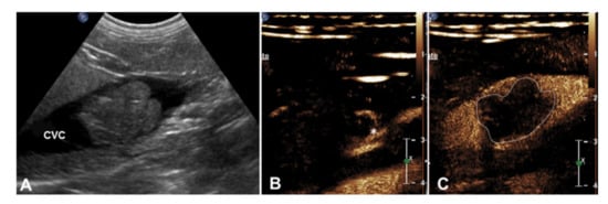 Similarly, the possibility of CEUS to detect endothelial invasion could be extremely useful for surgical planning, as, for instance, a cavectomy is required in case of endothelial invasion from the neoplastic adrenal tissue. The irregular and ill-defined margination of the thrombus, with particular attention to the portions adjacent to the vessel walls, could reflect the endothelial invasion, as confirmed histologically in one of our cases.