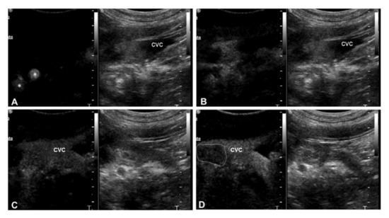 In human medicine, CEUS showed higher sensitivity in detecting vascularized tumor thrombosis when compared to CFD examination [14,15]. In humans, CEUS is also used to differentiate malignant thrombosis from a simple benign thrombus. In patients with hepatocellular carcinoma, CEUS shows high sensitivity (88–97.7%), specificity (100%) and accuracy (92.5–95.5%) in detecting and characterizing portal vein thrombosis, being the most sensitive imaging technique even when compared to contrast-enhanced computed tomography (CT) [13,14,17]. The intrinsic sensitivity of CEUS is higher than CT, as it allows single bubbles having the dimension of a red blood cell to be imaged and the contrast between contrast-enhanced blood and tissue is very high [22]. In addition, CEUS is performed in real time and allow to monitor continuously the contrast distribution, whereas in CT the selection of the vascular phase, i.e., the timing of the acquisition compared to the intravenous injection of the contrast agent, can influence the detection of thrombosis [15]. In small animals CT, the limited spatial resolution and the possible presence of streamlining artifact could reduce the possibility to correctly diagnose thrombosis [23], and CT may also be unable to detect endothelial invasion or evaluate the risk of fragmentations, both important features for a correct surgical planning [10].