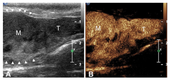 (A) Two-dimensional and (B) contrast-enhanced images of malignant thrombosis involving the thyroid in a dog with thyroid carcinoma (case 1). (A) The thyroid mass (arrows head) invades the lumen of the right thyroid vein (dotted); (B) contrast-enhanced ultrasound shows synchronous contrast uptake of the primary thyroid mass and the thrombus inside the thyroid vein.
