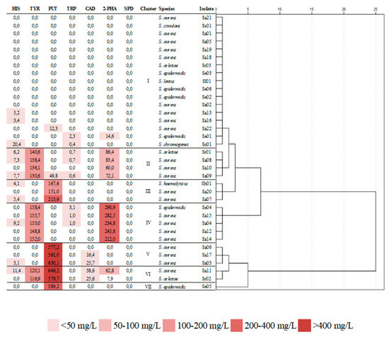Figure 1 shows the dendrogram obtained from the Hierarchical Cluster Analysis (HCA) of the BAs, which shows the grouping of isolates into seven clusters. One cluster is constituted by both non-amine-producing and very low-amine-producing isolates, and included S. aureus, S. simulans, S. epidermidis, S. arlettae, S. lentus, and S. chromogenes isolates. Clusters II and IV comprise isolates that produced moderate (cluster II) and high (cluster IV) amounts of both tyramine and 2- phenylethylamine, and included S. aureus, S. epidermidis, and S. arlettae isolates. Cluster III comprises moderate putrescine-producing isolates, and clusters V, VI, and VII include high putrescine-producing isolates.