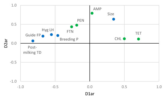 The relationship between farming practices and antibiotic resistance obtained the best fit with the two-dimensional solution. The first dimension had a high explanatory power with an eigenvalue greater than 0.8, while the second dimension had a slightly lower explanatory power with an eigenvalue greater than 0.7. The two dimensions produced a fit of 1.648 and explained 82.4% of the variation in the model. The first dimension had a canonical correlation of 0.789 and related resistance to TET and CHL, with Hyg LH, Guide FP, Breeding P, and Postdipping TD (Figure 2). The risk of finding staphylococci resistant to TET and CHL in milk decreased when the farm was enrolled in a Breeding P, applied both a Guide FP and a Postdipping TD, and had better Hyg LH.