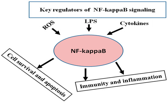 NF-κB is a common term used for inducible dimeric transcription factors. It is composed of a Rel family DNA binding protein which distinguishes common sequence motifs. Mammals express 5 Rel (NF-κB) proteins which are composed of two classes including Rel A (p65), c-Rel and Rel-B proteins which do not need proteolytic processing as the class is composed of NF-κB1 and NF-κB2 genes, encoded for p105 and p100, respectively, which do not require proteolytic processing to synthesize mature p50 and p52 NF-κB proteins [27]. The NF-κB protein was first found in murine B-lymphocytes, but currently, it has been identified in many cell types, including mammary epithelial cells [28]. Different external stimuli, such as tumor necrosis factor Alpha (TNF-α) [29], interleukin 1-beta (IL-1β) [30], LPS and reactive oxygen species (ROS) [31] after attachment with TLRs, activate NF-κB [32]. NF-κB signaling has an essential role in the regulation of immunity and inflammation [33], cell apoptosis, cell survival and proliferation (Figure 1) [34,35].