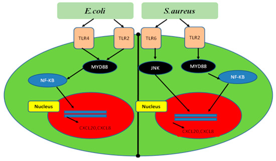 LPS, a bacterial virulence factor, interacts with TLRs which are residing on surface mammary epithelial cells [56]. Upon activation, the TLRs further engage myeloid differentiation factor 88 (MyD88) [57] and c-Jun N-terminal kinase (JNK) [58], which triggers NF-κB [32] and mitogen-activated protein kinase (MAPK) signaling. The translocation of NF-κB and MAPK signaling further regulates the production of target inflammatory genes [59,60,61,62]. The mechanism of NF-κB signaling activated by S. aureus and E. coli during mastitis is shown in Figure 2.