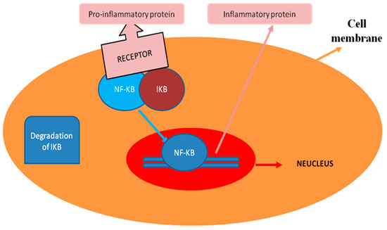 Besides S. aureus and E. coli, various inflammatory cytokines activate NF-κB signaling regulation in mammary epithelial cells. The NF-κB and MAPK pathways activate pro-inflammatory cytokines interleukin 6 (IL-6), IL-1β and TNF-α [63]. Nuclear factor-κB is a nuclear transcription factor that exists in an inactive form in the cytoplasm and is bound to its inhibitor IκB [64,65]. Once activated, the NF-κB unit p65 separates from IκB and translocates from the cytoplasm to the nucleus, where it regulates inflammatory gene expression [66]. The pathogenic message usually causes the liberation of NF-κB from IκB [65]. The regulation of the inflammation through NF-κB by pro-inflammatory cytokines is shown in Figure 3. The promoter of the inflammatory genes contains binding sites for NF-κB, and thus mostly depends on NF-κB for its regulation [67]. It has been reported that active NF-κB complexes cannot be detected in healthy cow milk cells, while the NF-κB elevated level was noticed in the milk cells of cows with acute mastitis. In addition, the activity of NF-κB in milk cells varies from low to high in chronic mastitis [67]. Stimulation of LPS causes mammary epithelial cells to produce cytokines TNF-α, IL-6 and IL-1β [68]. The increased levels of TNF-α, IL-6 and IL-1β have been observed in LPS-infused mammary glands [69]. Furthermore, Blum et al. reported the high level of cytokines (TNF-α, IL-6 and IL-17), somatic cell count (SCC), and up-regulation of TLR4 expression in leukocytes of the milk of an E. coli-induced mastitic cow [70]. In the mammary glands, inflammation is associated with an increased level of neutrophil chemo-attractants and the cytokines IL-1ß, IL-6, IL8 and TNF-α [71,72]. The expression level reported for IL8 and TNF-α in E. coli induced-mastitis in bovine mammary epithelial cells (BMECs) was much higher than for S. aureus, which is due to the weak Lipoteichoic acid (LTA) induction of TNF-α, or inactivation of NF-κB signaling [73]. Boulanger et al. observed that NF-κB was highly associated with the level of the expression of interleukin-8 and granulocyte/macrophage colony-stimulating factors, two NF-κB-dependent cytokines critically linked to the regulation and continuation of neutrophilic inflammation. Altogether, these findings suggested the crucial role of NF-κB in the pathogenesis of mastitis.