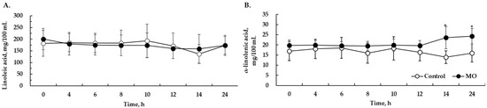 Table 5). Lower stearic acid levels were observed in the MO group than in the LO or control groups during incubation, suggesting greater protection of LA and ALA in MO. Moreover, the control and LO groups showed a more rapid appearance and disappearance of CLA (an intermediate product between LA and stearic acid) than the MO group, supporting the successful encapsulation of linseed oil in MO.