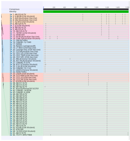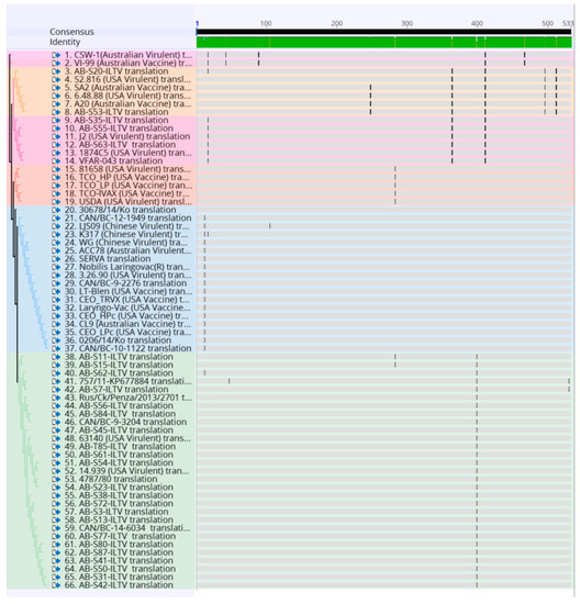 Alignment of the amino acid sequence of 32 Canadian ILTV strains and 36 ILTV reference strains using MUSCLE and Geneious software package. Vertical lines indicate nucleotide change positions. Samples are color-coded as the phylogenetic tree.