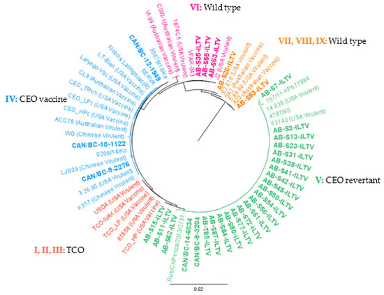 These ILTV strains could be grouped into four previously published clusters [34], as shown in Figure 4. Of the BC ILTV strains, three were classified in group IV (CEO vaccine), and the remaining two in group V (CEO revertant). Of the AB isolates, 22 clustered in group V, 3 in cluster VI (wild type), and 2 in cluster VII, VIII, and IX (wild type) (Figure 4).