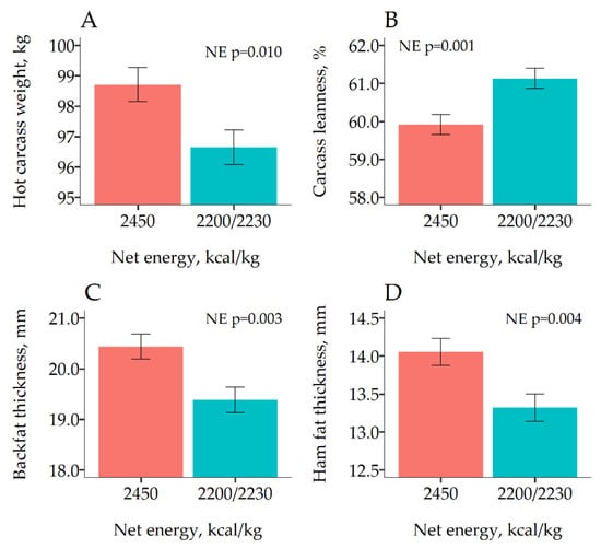 Least square means of the effect of dietary net energy (NE) on carcass traits measured on the 380 first marketed pigs at day 86 of Experiment 2. For B, C and D, the response was adjusted using carcass weight (HCW) as a linear predictor. Error bars represent the standard error of the mean.