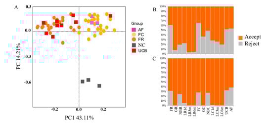 - Bokulich, N.A.; Subramanian, S.; Faith, J.J.; Gevers, D.; Gordon, J.I.; Knight, R.; Mills, D.A.; Caporaso, J.G. Quality-filtering vastly improves diversity estimates from Illumina amplicon sequencing. Nat. Methods 2013, 10, 57–59. [Google Scholar] [CrossRef]