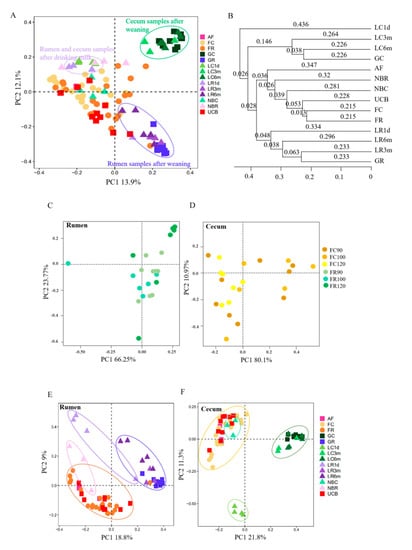 Zou, X.; Liu, G.; Meng, F.; Hong, L.; Li, Y.; Lian, Z.; Yang, Z.; Luo, C.; Liu, D. Exploring the Rumen and Cecum Microbial Community from Fetus to Adulthood in Goat. Animals 2020, 10, 1639. https://doi.org/10.3390/ani10091639
