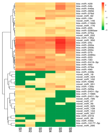 Sequence alignment and subsequent exploration were achieved using the specified Bos_mutus.v2.0 (http://www.ncbi.nlm.nih.gov/genome/?term=yak) as the reference genome. The Bowtie software (Version v1.0.0, Johns Hopkins University, Baltimore, MD, USA) was used to sequence the unannotated reads with the reference genome to obtain the positional information on the reference genome, which is mapped reads. For the biological characteristics of miRNA, we used the miRDeep2 software package to compare the reads on the reference genome with the known miRNA precursor sequences in the miRBase database (http://www.mirbase.org/) to identify the expression of known miRNAs. After successive filtering of these data sets, we identified a total of 1074 miRNAs (670 known miRNA and 404 novels miRNA) in the libraries (Table S3). Amongst these miRNAs, 51 differentially expressed miRNAs were found, in which 25 miRNAs were downregulated and 26 miRNAs upregulated in the experimental group vs. the control group (Figure 2). The MA diagram provides an intuitive view of the overall distribution of the expression levels and differential multiples of the two groups (Figure 3). Systematic cluster analysis was performed to analyze the similarity of miRNAs with different expressions in the two groups of ovaries. The heat map shows the aggregation of CS and CON due to their similar expression profiles (Figure 4).