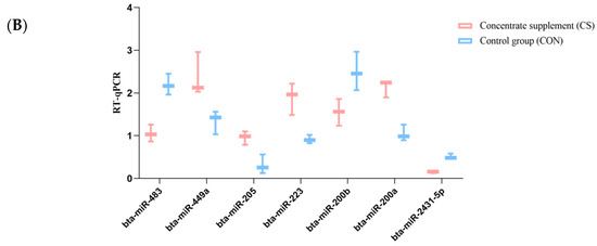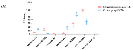 We performed qRT-PCR to detect the expression levels of the differentially expressed miRNAs and to confirm the reliability of the sequencing data (Figure 5). For this, we selected seven known miRNAs confirmed in the CS and CON group ovarian samples of yak. The relative expression levels of the seven selected miRNAs indicated that miR-449a, miR-205, and miR-200a were significantly upregulated in the CS than the CON group (p < 0.05), while miR-483, miR-200b, miR-223, and miR-2431-5p were downregulated in the CS group (p < 0.05). The relative expression levels of the seven differentially expressed miRNAs were consistent with the RNA sequencing results. It showed that the sequencing results were true and reliable.
