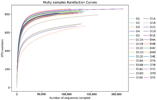 The main objective in this study was to determine the composition and stability of the gut microbiota over a short duration (16 days). In order to determine this, fresh fecal matter is required. The sampling procedure for fresh fecal matter was as follows: the G group’s samples were obtained in the morning before feeding, while the D group samples were obtained every morning before 8:00 on feedlot feeding day 1 (D1), day 4 (D4), day7 (D7), day11 (D11), and day 16 (D16). Disposable sterile gloves were worn for sample collection to avoid pollution. A total of 30 samples were collected and placed in 5 mL frozen tubes to avoid cross-contamination between them. The samples were immediately frozen in liquid nitrogen and stored at −80 °C.