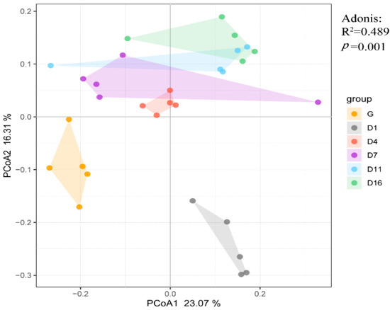 Principal coordinated analysis (PCoA) analysis of overall diversity based on Bray–Curtis was performed to compare the six groups (Figure 2). We can see a shift in the gut microbial population structure by transition of the diet, and such a shift was also observed in D1 and D4–D16, but the distance between the groups gradually decreased from D4. Most samples clustered together according to their particular group, suggesting that each group hosts its own distinct bacterial community. Adonis (PERMANOVA) showed this alteration to be statistically significant (R2 = 0.489, p = 0.001).