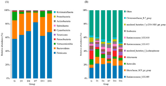 Phylum (A) and genus (B) (relative abundance) composition for fecal samples collected from G (grazing) group and D1, D4, D7, D11, and D16 (feedlot feeding days 1, 4, 7, 11, and 16, respectively).