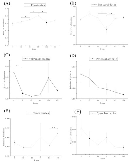 MetaStats analysis of top phylum bacterial of yak, (A–F) are the top six phylum, and * means p-value < 0.05, ** means p-value < 0.01. (G: grazing; D1, D4, D7, D11, and D16: feedlot feeding days 1, 4, 7, 11, and 16, respectively).