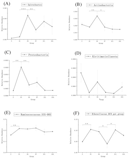 MetaStats analysis of top phylum and genus bacterial of yak: (A–D) phylum and (E,F) genera, and * means p-value < 0.05, ** means p-value < 0.01, *** means p-value < 0.001. (G: grazing; D1, D4, D7, D11, and D16: feedlot feeding days 1, 4, 7, 11, and 16, respectively).