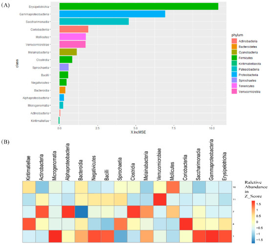 In order to determine the key bacteria involved in breaking the gut micro-ecology stability, we used a random forest machine learning algorithm. To establish a model that correlated gut microbiota with time in the D groups, the same diet was applied in each group, so that only the effect of time would be observed. The model explained 72.75% of the gut microbiota variance related to the adaptation of time. To reveal the importance of bacterial classes as key bacteria taxa in the whole adaptation period, we performed a 10-fold cross-validation. The results showed that the error rate was lowest when the feature was equal to 16. All 16 classes are shown in Figure 6A according to time-discriminatory importance. Erysipelotrichia (Firmicutes), Gammaproteobacteria (proteobacteria), Saccharimonadia (Patescibacteria), Coriobacteriia (Actinobacteria), and Mollicutes (Tenericutes) were the top five biomarkers based on class level. Furthermore, the majority of bacteria showed higher relative abundance from D1–D7, and the relative abundance decreased after that (Figure 6B). There was little change observed from D11 to D16 in most of the classes, especially Erysipelotrichia, Gammaproteobacteria, Saccharimonadia, and Coriobacteriia, which had a higher increase in mean squared error (%, %IncMSE). Some bacteria still exhibited changes in D11–D16, like Mollicutes and verrucomicrobiae; however, they had few changes from D1–D7, which is contrary to that observed of other bacteria.