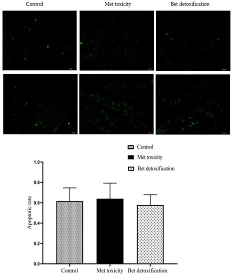 The effects of Bet on cardiomyocyte apoptosis in geese with HHcy are shown in Figure 1. Compared with the control diet, the Met toxicity diet significantly increased cardiomyocyte apoptosis rates (p < 0.05), but the Bet detoxification diet reduced the apoptosis rates.