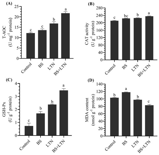 Figure 1 shows the change in antioxidant enzymes activities and MDA levels in the hepatopancreas of S. rivulatus fed the experimental diets. The activities of T-AOC, GSH-Px, and CAT increased significantly with fish fed BS, LTN, and their combination compared to fish fed the control group. The highest level of antioxidant enzymes activities was recorded with fish fed a BS+LTN supplemented diet. Dietary supplementation with BS+LTN significantly decreased the MDA content (p < 0.05) compared to other groups.