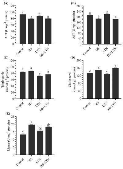 ALT and AST activity in the hepatopancreas were significantly decreased in BS and BS+LTN (p < 0.05) supplemented groups compared to the LTN and control group. In addition, the total cholesterol level in fish fed a BS+LTN supplemented diet was significantly higher than those found in both LTN and BS groups (p < 0.05), while the highest and lowest TG level was shown in the BS group and LTN group, respectively (Figure 2).