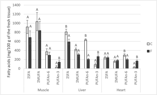 It is necessary to mention that in cases when a difference in fatty acid deposition was found between the dietary groups, these differences were not affected by the total lipid content, which did not differ between the groups in any of the tested tissues (p > 0.05); the values of the F- and C-groups were as follows (mean ± SEM; in %): 2.00 ± 0.09 and 2.30 ± 0.15 in the muscle, 3.13 ± 0.18 and 3.54 ± 0.16 in the liver, 1.82 ± 0.35 and 1.56 ± 0.05 in the heart, and 54.93 ± 1.96 and 49.72 ± 1.79 in the VAT, respectively.