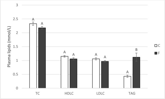 When evaluating the plasma lipid profile, LC-PUFA n-3 are known [26] to decrease plasma TAG via the activation of the transcription factor PPARα (peroxisome proliferator-activated receptor α) and the inhibition of SREBP-1 (sterol response element-binding protein 1), which stimulate fatty acid β-oxidation and inhibit fatty acid synthesis. However, the F-diet conspicuously increased plasma TAG in the present experiment (Figure 2). It is plausible that it is not fatty acid composition but rather the sheer amount of fat in the F-diet (much higher than in the control diet) that is the reason for the TAG increase. Huang et al. [20] came to the same conclusion using diets with either 0% or 6% of added lipid, which resulted in a significant (p < 0.05) increase in the plasma TAG in pigs fed a fatty diet (0.40 vs. 0.49 mmol L−1). Dietary lipid supplementation also increased the serum TAG in pigs in the study of Adhikary et al. [23].