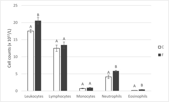 In addition to increasing (p < 0.05) the counts of leukocytes and neutrophil and eosinophil granulocytes in pig blood, dietary fish oil also tended to increase lymphocyte numbers (Figure 3) and significantly decreased (p < 0.05) hematocrit (to 35.7%) in comparison with the control (37.1%). Counts of erythrocytes (6.51 × 1012 L−1; the same value in the F- and C-groups) and the amount of hemoglobin (122.2 vs. 122.7 g L−1 in the F- and C-pigs) were not affected.